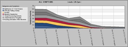 Stacked chart of symptom severity over the course of sessions. Each symptom was scored on a 0-10 Likert scale. Average starting severity: 8.6/10; average ending severity: 0.6/10.