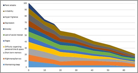 This paper recounts the history of neurofeedback in application to PTSD, with a primary focus on combat-related trauma among military veterans. The role of different protocols is discussed. The long-term history of recovery by a veteran, by way of ILF neurofeedback and complementary Alpha-Theta training is presented. Symptom-tracking data are shown in the Figure for eleven dominant complaints. Symptom severity is appraised on a 0-10 Likert scale. Symptom severity declined from an average of 9.1 to an average of 1.8 over the course of 66 training sessions that extended over several years.